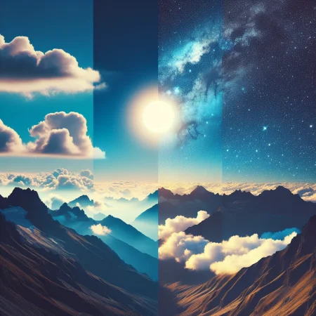 Generate an image representative of the day with no text. This image should capture the morning’s sunrise over the mountains, followed by a bright sunny afternoon with fluffy white clouds in a clear blue sky, gradually transitioning into a star-studded night sky. Text generated by gpt-3.5-turbo, image && image message generated by dall-e-3.