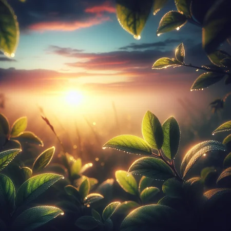An image representing the concept of a new day. The sky is just beginning to lighten with the early morning sun, casting soft, warm hues of orange and pink across the sky. There is a freshness and sense of renewal in the air, signifying the start of a new day. Dew clings to fresh, green leaves, softly glittering in the glow of the sunrise. The scene exudes quiet tranquility, offering a sense of optimism and new opportunities that each day brings. The image should encapsulate the promise and potential inherent in the beginning of every new day. Text generated by gpt-3.5-turbo, image && image message generated by dall-e-3.