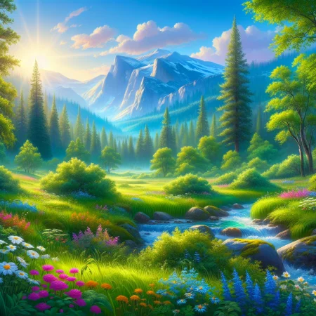 Generate an image displaying a calming nature scene that encapsulates the feeling of the day. Possible elements could include a sunlit meadow with vibrant wildflowers, a serene mountain landscape under the bright blue sky, or a babbling brook flowing through a lush green forest. Text generated by gpt-3.5-turbo, image && image message generated by dall-e-3.