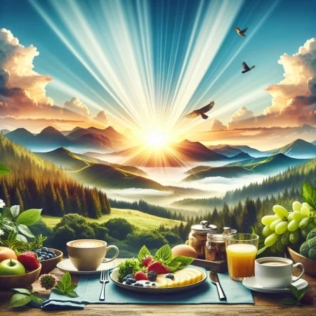 An uplifting image symbolizing a fresh start of a day, perhaps showcasing the morning sun rising against a scenic backdrop of mountains, forests or oceans, emitting rays that bring warmth, light, and rejuvenation. A couple of birds might be flying across the sky, signifying freedom and new possibilities. It could also feature a well-set breakfast table with healthy food and beverage options representing preparedness for the day ahead. Text generated by gpt-3.5-turbo, image && image message generated by dall-e-3.